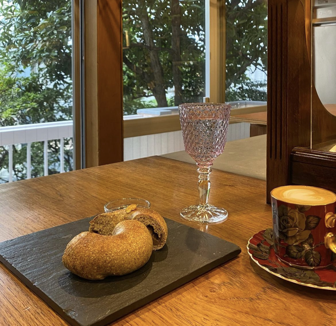 落ち着いた雰囲気の喫茶店。好みや気分に合わせて、注文を受けてからコーヒーを淹れてくれる。緑に囲まれたテラス席